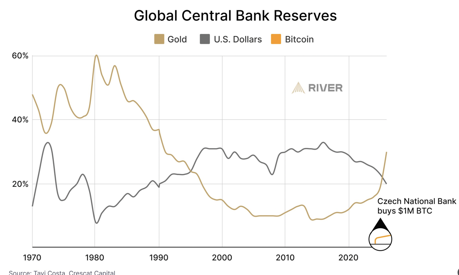 Fait notable, le Bitcoin commence tout juste à apparaître dans certaines réserves, bien que son poids reste encore faible. Cette première étape pourrait annoncer une adoption progressive du BTC comme réserve de valeur numérique, aux côtés de l’or, dans un monde où la diversification des réserves devient de plus en plus stratégique.