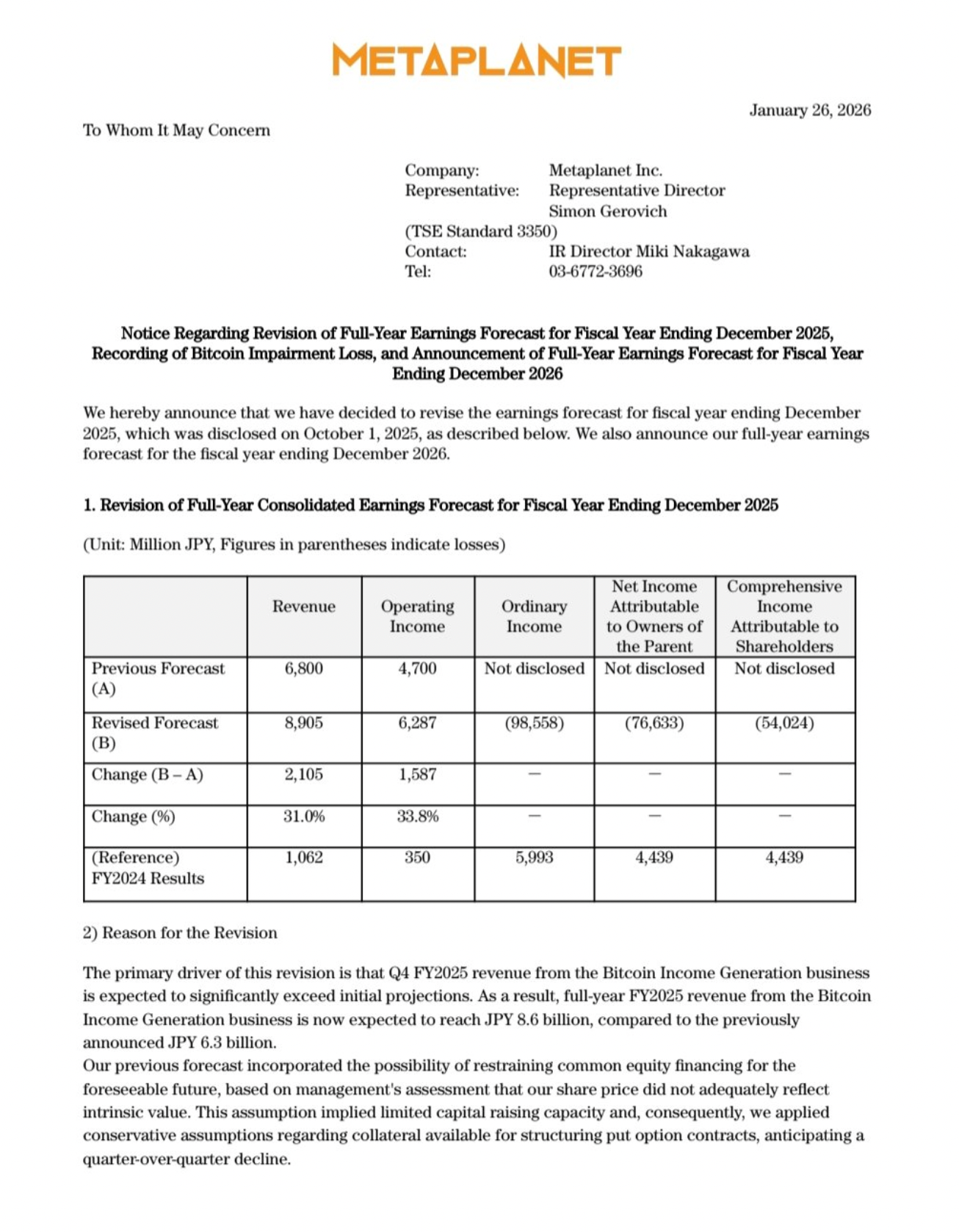 Metaplanet a annoncé une augmentation de ses prévisions de chiffre d’affaires et de résultat opérationnel pour l’année 2025, tout en publiant des perspectives encore plus élevées pour 2026. Cette révision à la hausse indique que l’entreprise anticipe une performance financière supérieure à ses estimations précédentes.