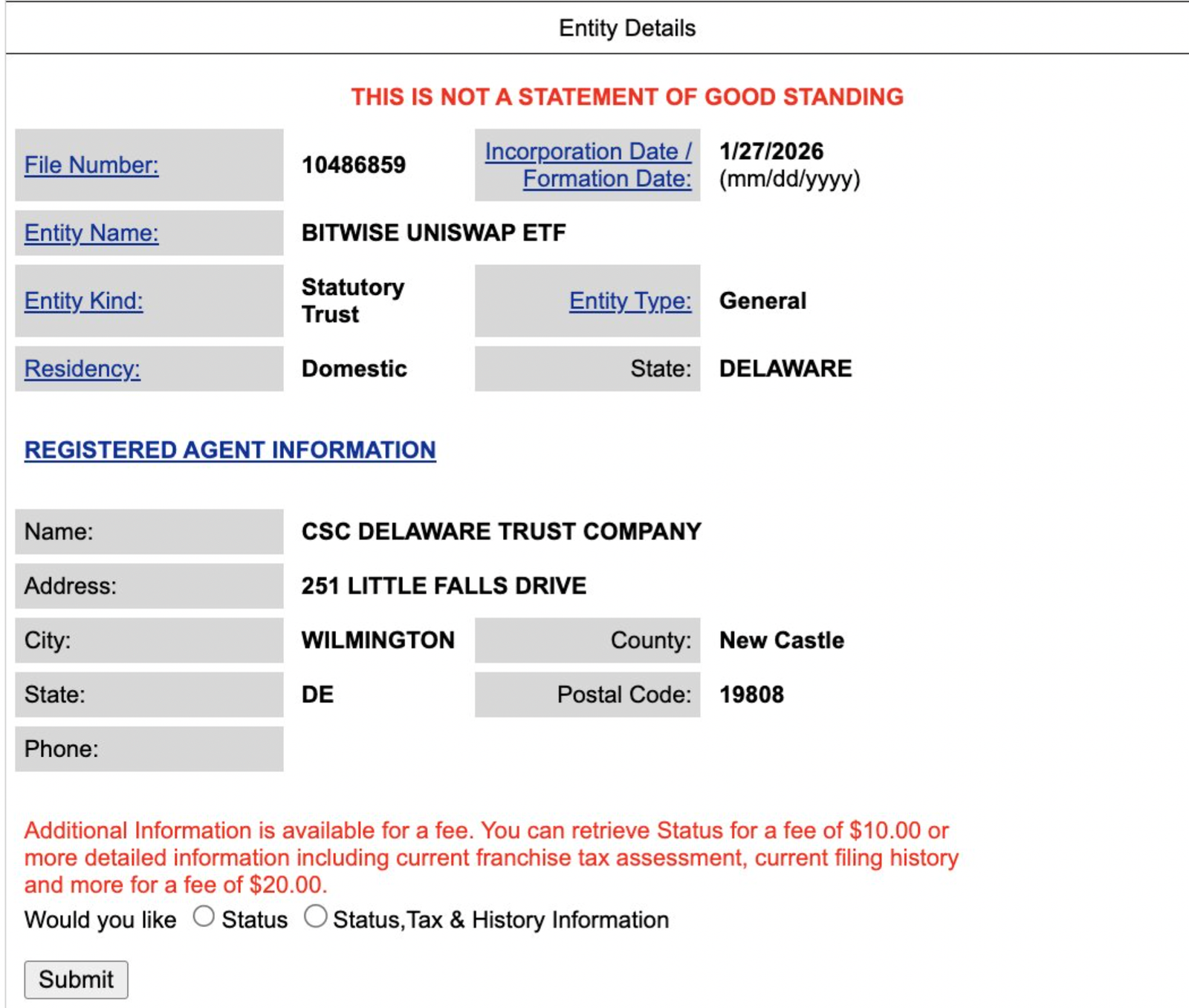 Bitwise sâest officiellement enregistrĂ© pour lancer un ETF basĂ© sur Uniswap dans le Delaware, signalant que le dĂ©pĂŽt officiel pourrait ĂȘtre imminent. Cette dĂ©marche montre lâintĂ©rĂȘt croissant des institutions pour les tokens DeFi et leur volontĂ© de crĂ©er des produits rĂ©glementĂ©s permettant dâinvestir dans ces actifs.