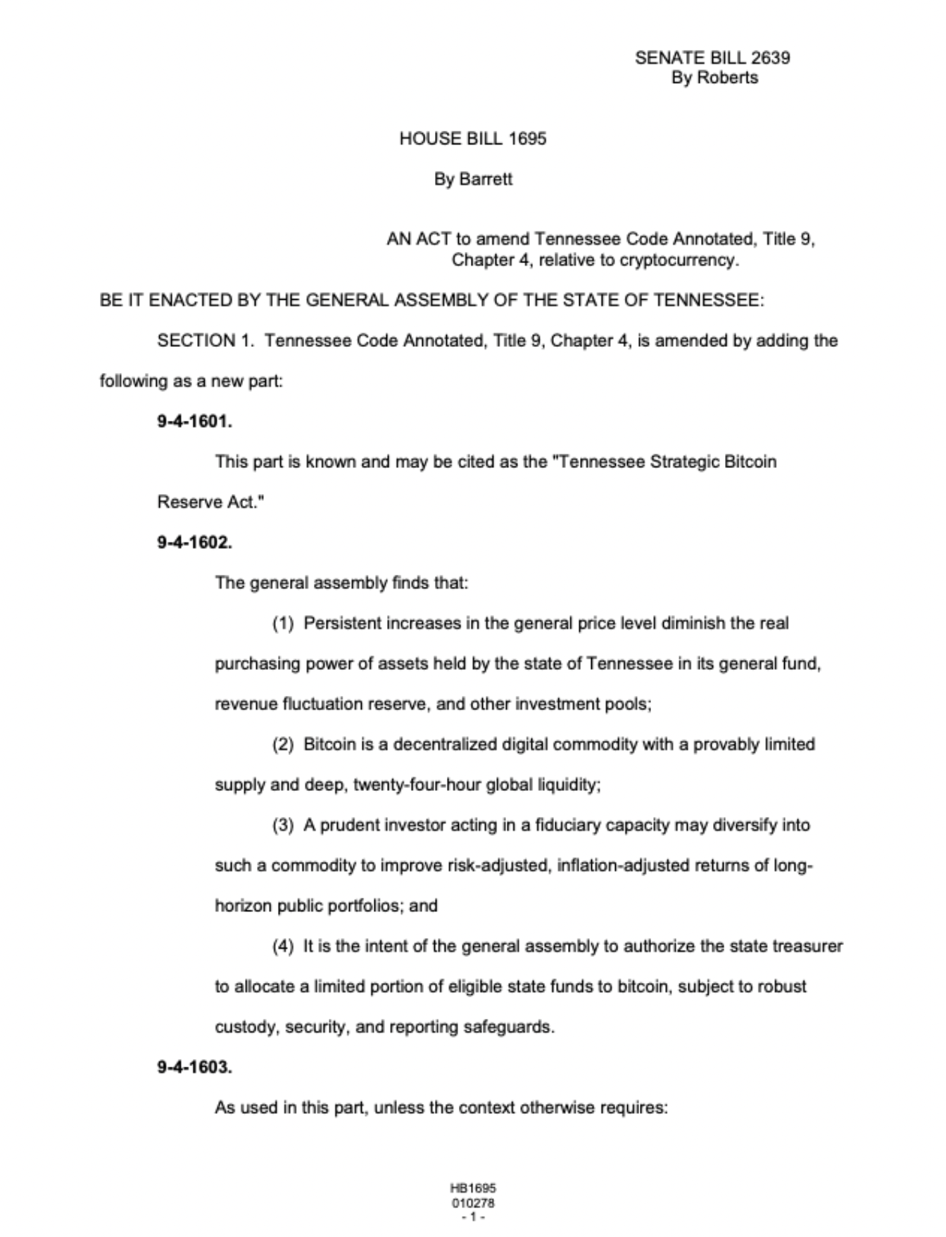 Le Strategic Bitcoin Reserve Act du Tennessee a été recommandé pour adoption et transmis au comité Finance, Ways & Means.