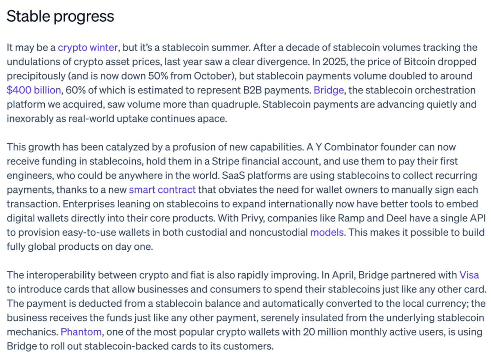 Le marché des stablecoins franchit un nouveau cap en 2025. Selon le rapport annuel de Stripe, le volume de paiements en stablecoins a atteint 400 milliards de dollars, soit un doublement par rapport à l’année précédente.