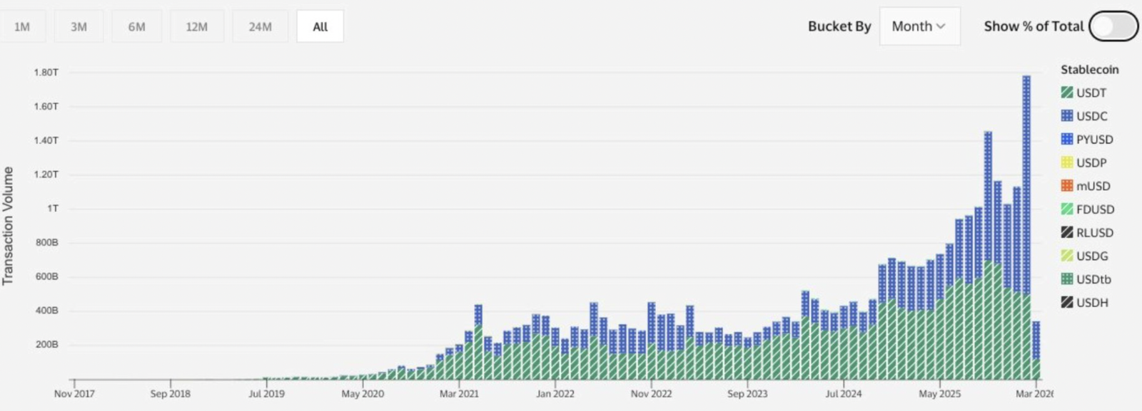 Le volume total des transactions de stablecoins a atteint un nouveau sommet de 1,8 $T, reflétant l’adoption massive des monnaies numériques stables pour :